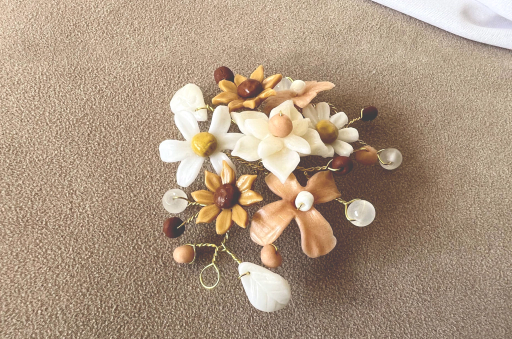 Tocado mediano confeccionado en alambre dorado, con flores de porcelana fria, en tonos blanco, beige,amarillo y marrón.